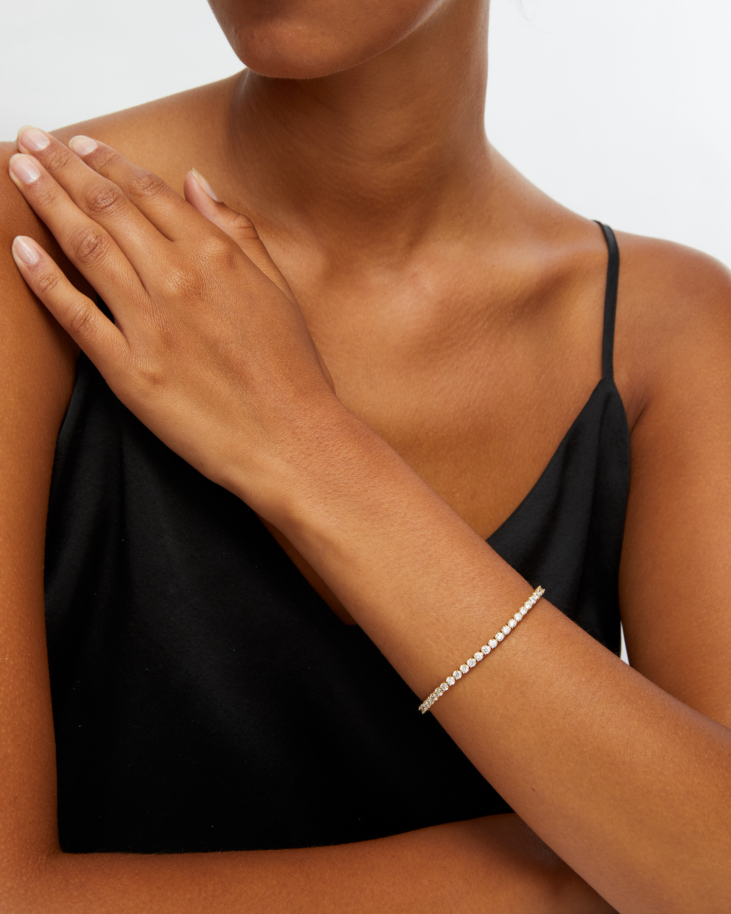 Composed of a line of 52 claw-set brilliant-cut diamonds completed by a concealed box clasp, the diamonds together weighing approximately 6.34 carats, mounted in 14ct gold, length 180mm.