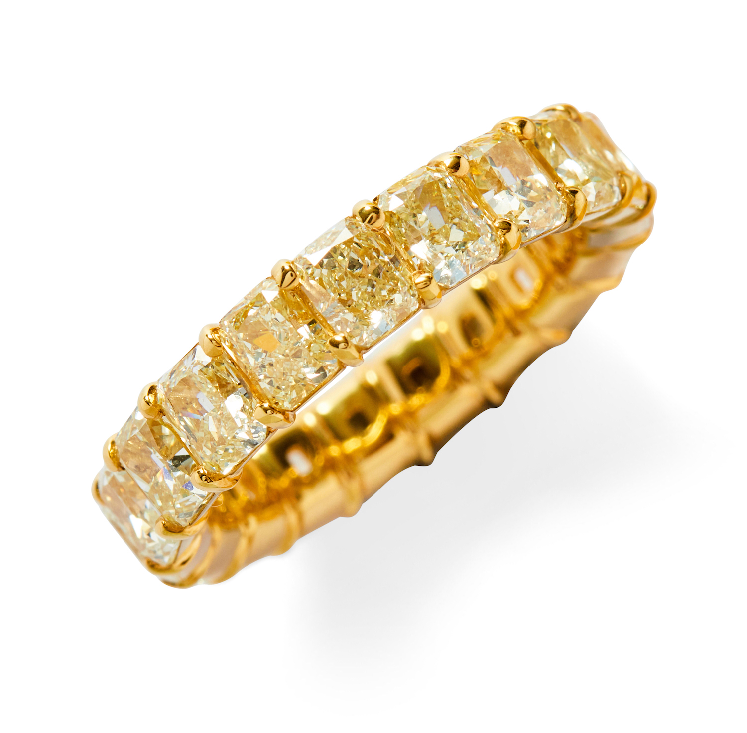 Designed as a continuous line of 19 claw-set fancy yellow radiant-cut diamonds together weighing 6.18 carats, mounted in 18ct gold, size M.