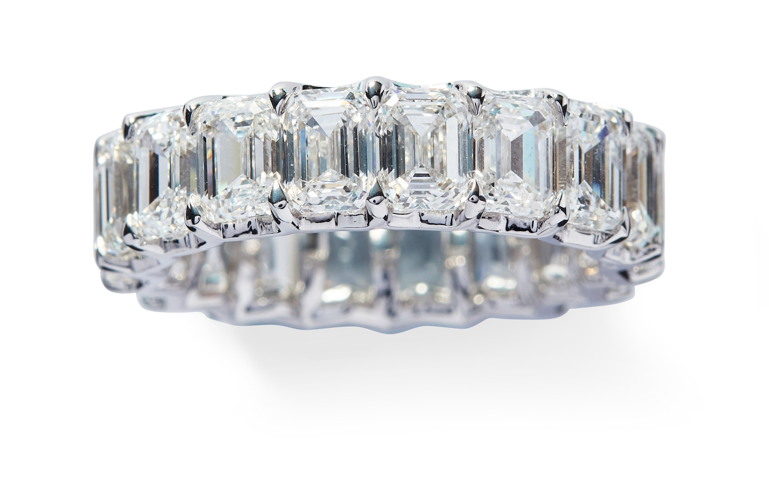 Designed as a continuous row of 18 claw-set emerald-cut diamonds together weighing 9.02 carats, mounted in 18ct white gold, size N.