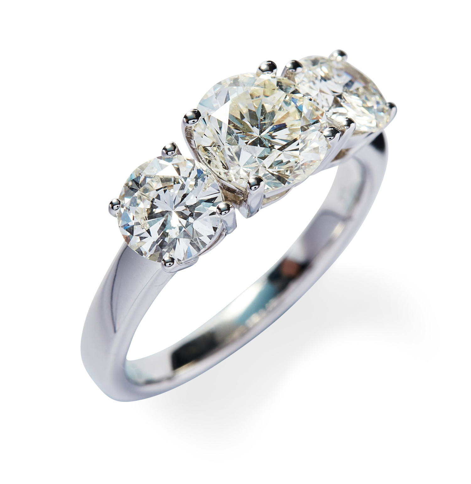 Centring a claw-set brilliant-cut diamond weighing 1.68 carats, flanked by a pair of brilliant-cut diamonds together weighing 1.41 carats, mounted in 18ct white gold, size N1/2.