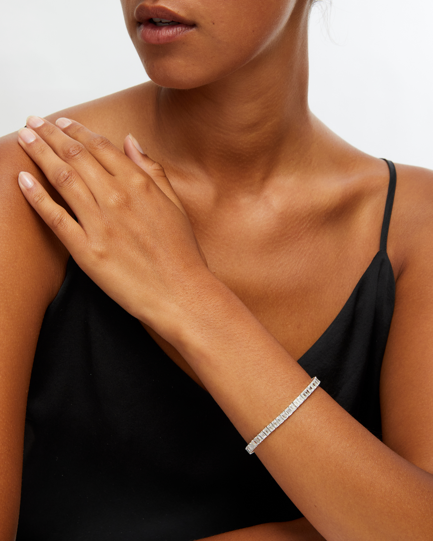 Composed of a line of 49 claw-set emerald-cut diamonds completed by a concealed box clasp, the diamonds together weighing 15.53 carats, mounted in 18ct white gold, length 180mm.