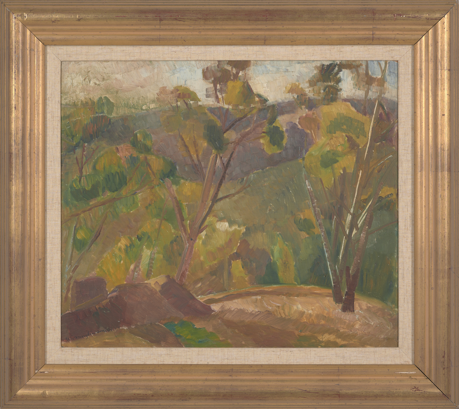 Grace Cossington Smith was one of the most innovative Australian artists of the twentieth century. In the 1940s, many of her peers were painting pure abstraction, whilst the majority of Cossington Smith's subject matter remained still life, interiors, bush and garden scenes and landscapes. For Cossington Smith, the garden and gully outside her studio and around Kuringai Chase provided constant inspiration. So, too, the French Post-Impressionist, Paul Cézanne, informed much of her work especially her landscapes. Of all the painters she admired, Cossington Smith noted that 'there aren't any others that impress me like Cézanne ... I think that he painted what I wanted'. (Interview with Alan Roberts, 1970).