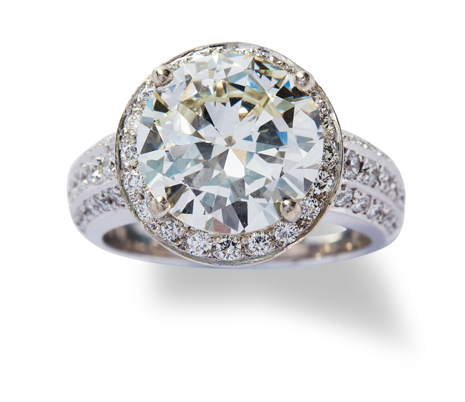 Centring a claw-set round brilliant-cut diamond weighing 5.34 carats, framed by a halo of pavé-set brilliant-cut diamonds, to similarly set shoulders, the small diamonds together weighing approximately 0.44 carats, mounted in 18ct white gold, size O.