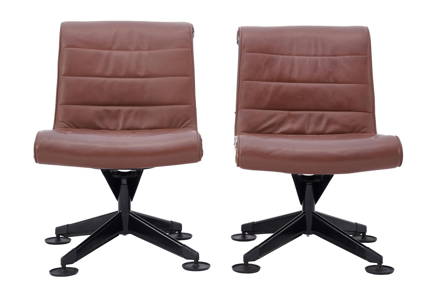 Brown leather, plastic, and steel. Four-point swivel bases.