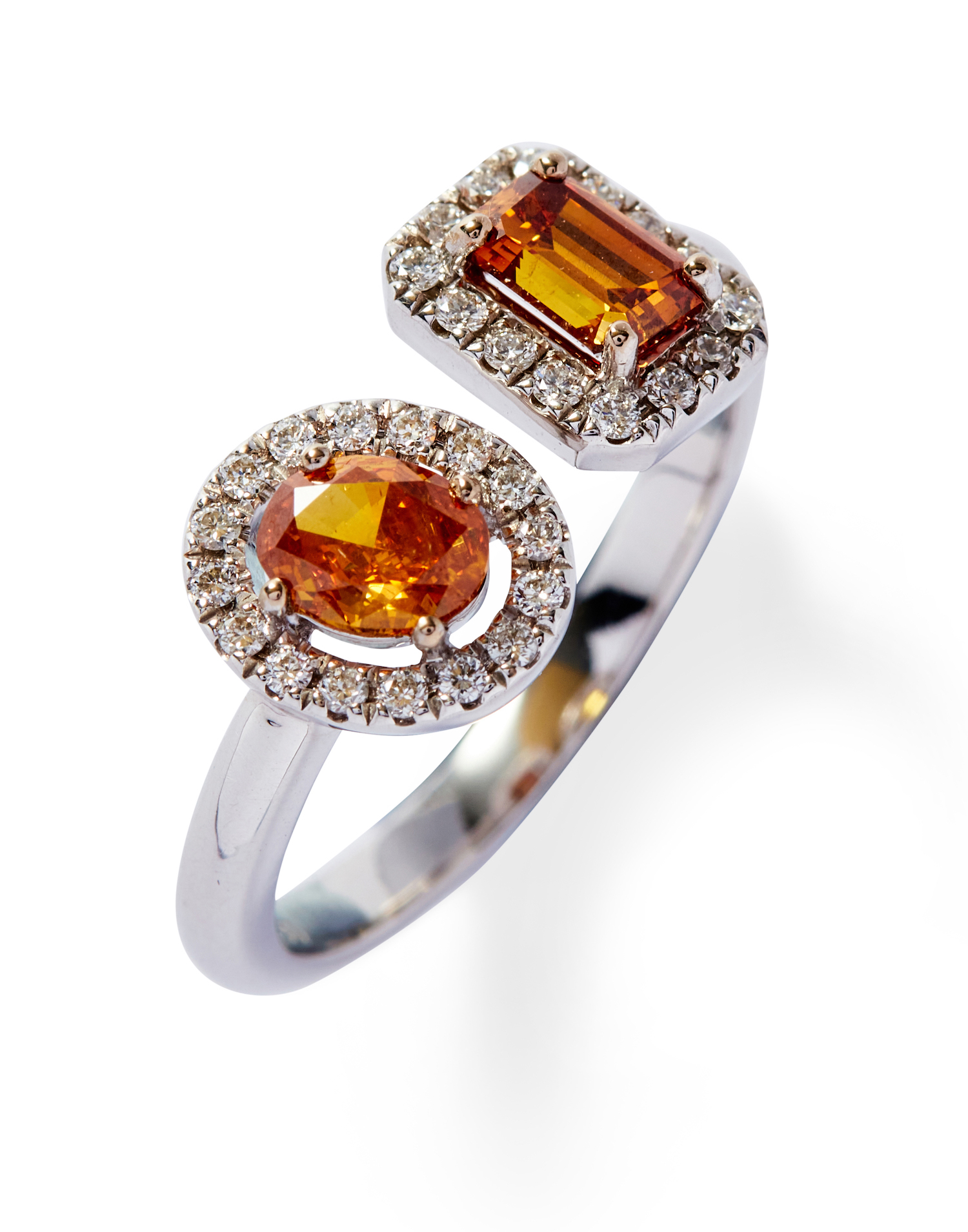 Of toi et moi design with cluster terminals, one claw-set with a natural fancy deep yellowish orange oval modified brilliant-cut diamond weighing 0.41 carats, framed by pavé-set near colourless brilliant-cut diamonds, the other claw-set with a natural fancy deep brownish yellowish orange emerald-cut diamond weighing 0.48 carats, similarly framed by near colourless diamonds, the 30 near colourless diamonds together weighing 0.38 carats, mounted in 18ct white gold, size N.