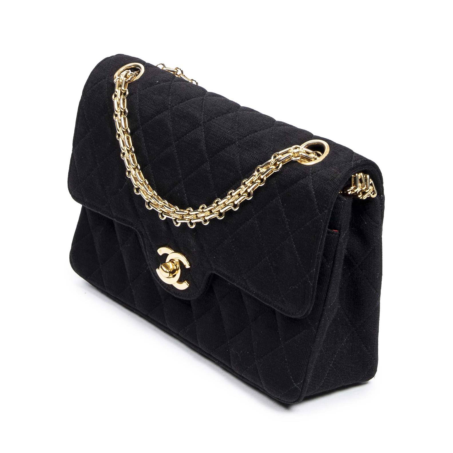 CHANEL, VINTAGE CLASSIC DOUBLE FLAP - Styled in quilted jersey fabric with gold tone hardware, circa 1986 - 1988, 23.5 x 14.5 x 6.5cm.