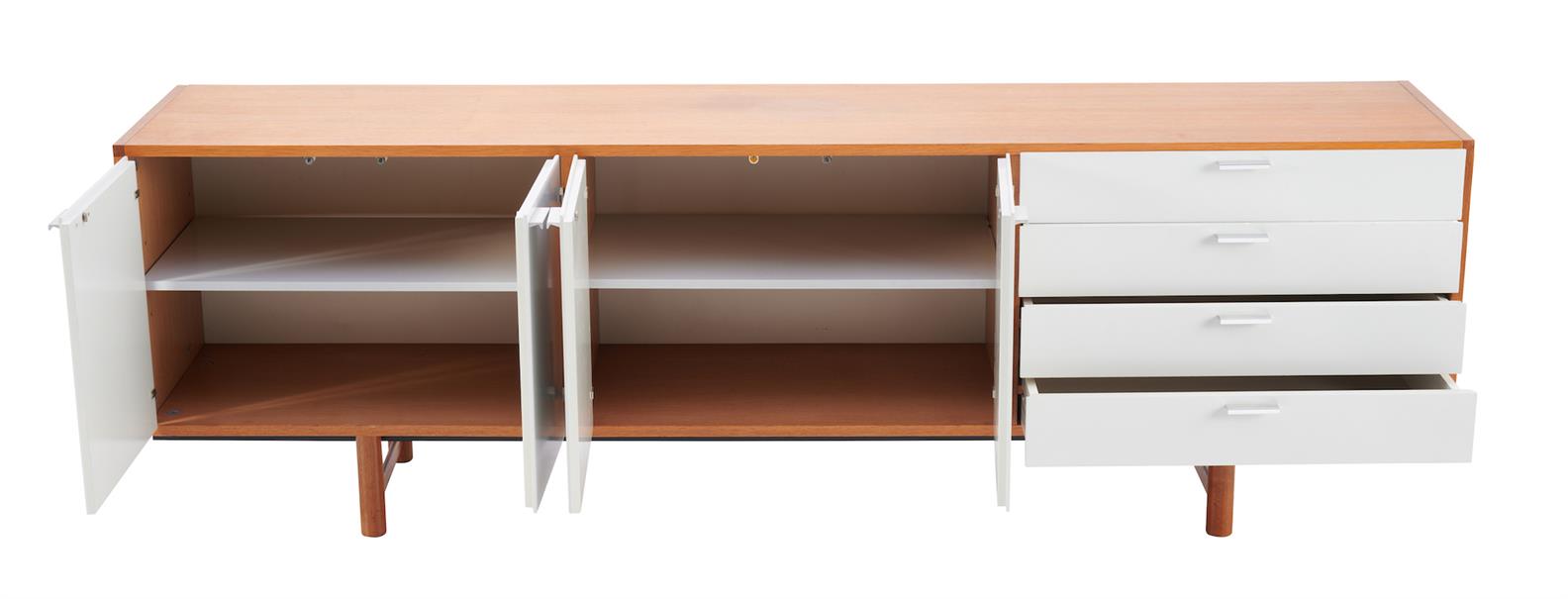 White painted oak, metal, and oak. Four drawers, four cupboard doors.
