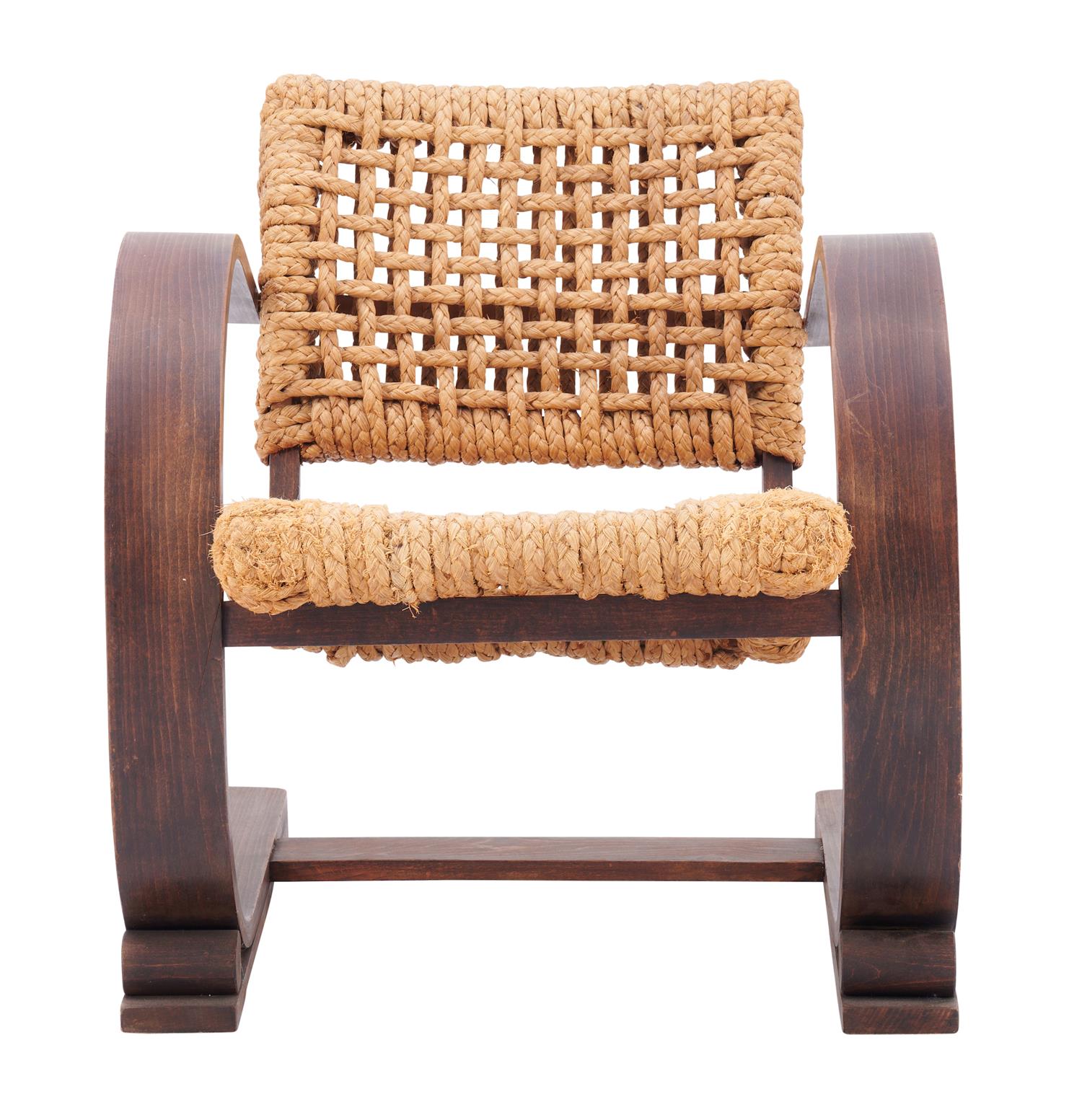 Curved bentwood frame, braided rope seats and back rests. Stamped to base.