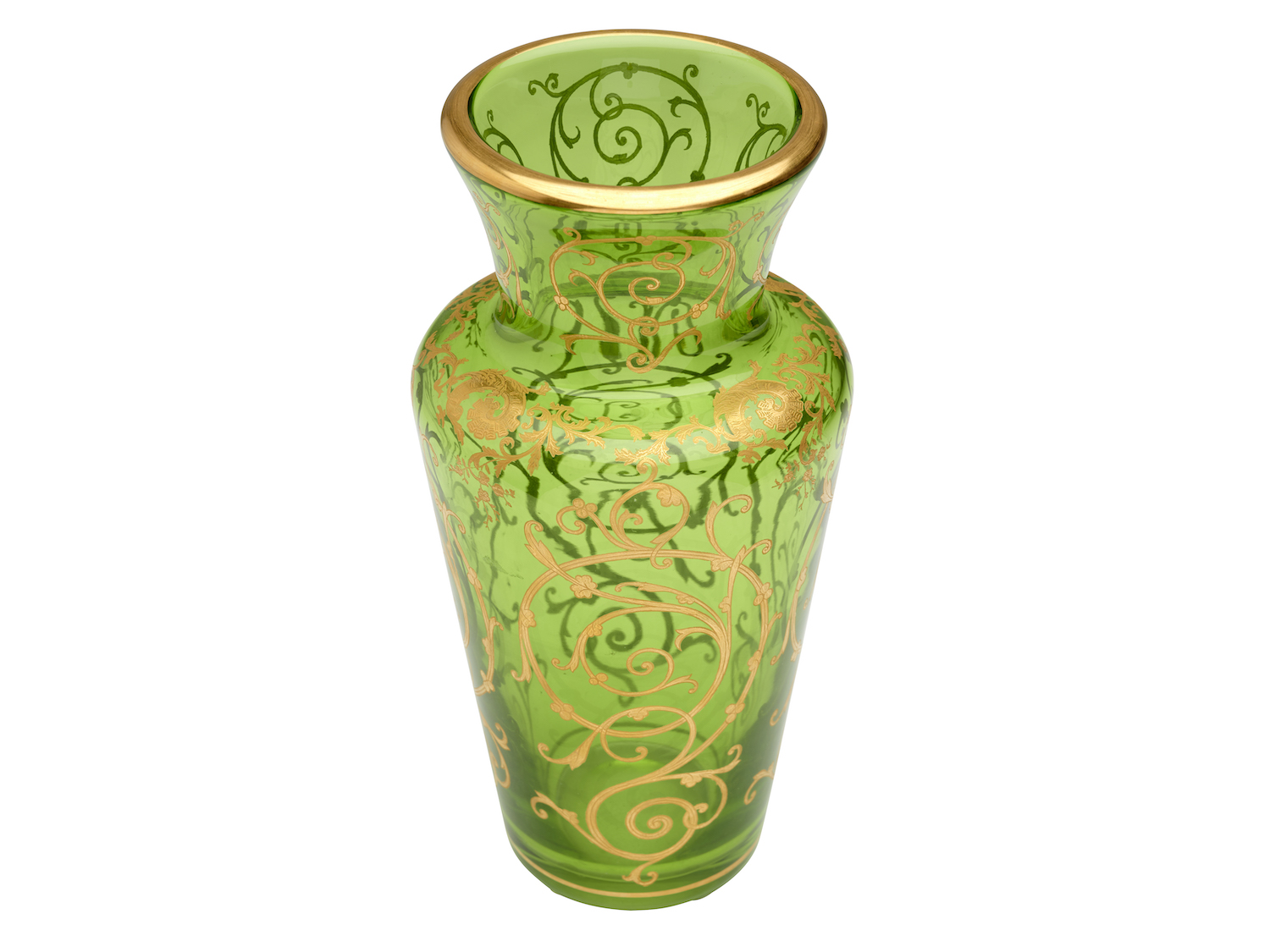 Of tapering form with a flared rim, in a thick chartreuse green crystal engraved and decorated in 24-carat gold scrollwork decoration, accompanied by original box with certificate of authenticity, marked edition number 7