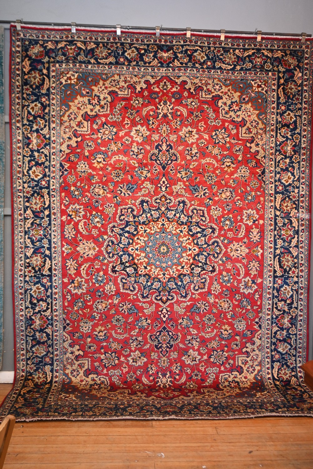 A PERSIAN ISFAHAN NAJAFABAD CARPET. 100% WOOL PILE. HAND-KNOTTED & WITH CLASSIC ISFAHAN DESIGN OF CENTRAL MEDALLION IN CREAM, FRENCH AND NAVY BLUE, QUARTERED CORNER MEDALLIONS. ALL OVER PATTERN OF 16TH CENTURY SHAH ABBAS PALMETTES & ESLIMI SCROLLS ON A ROYAL RED FIELD. THE IRANIAN CITY OF ISFAHAN HAS LONG BEEN ONE OF THE CENTRES FOR PRODUCTION OF FAMOUS PERSIAN CARPETS. SIZE: 377 X 270 CM. ORIGIN: PERSIA