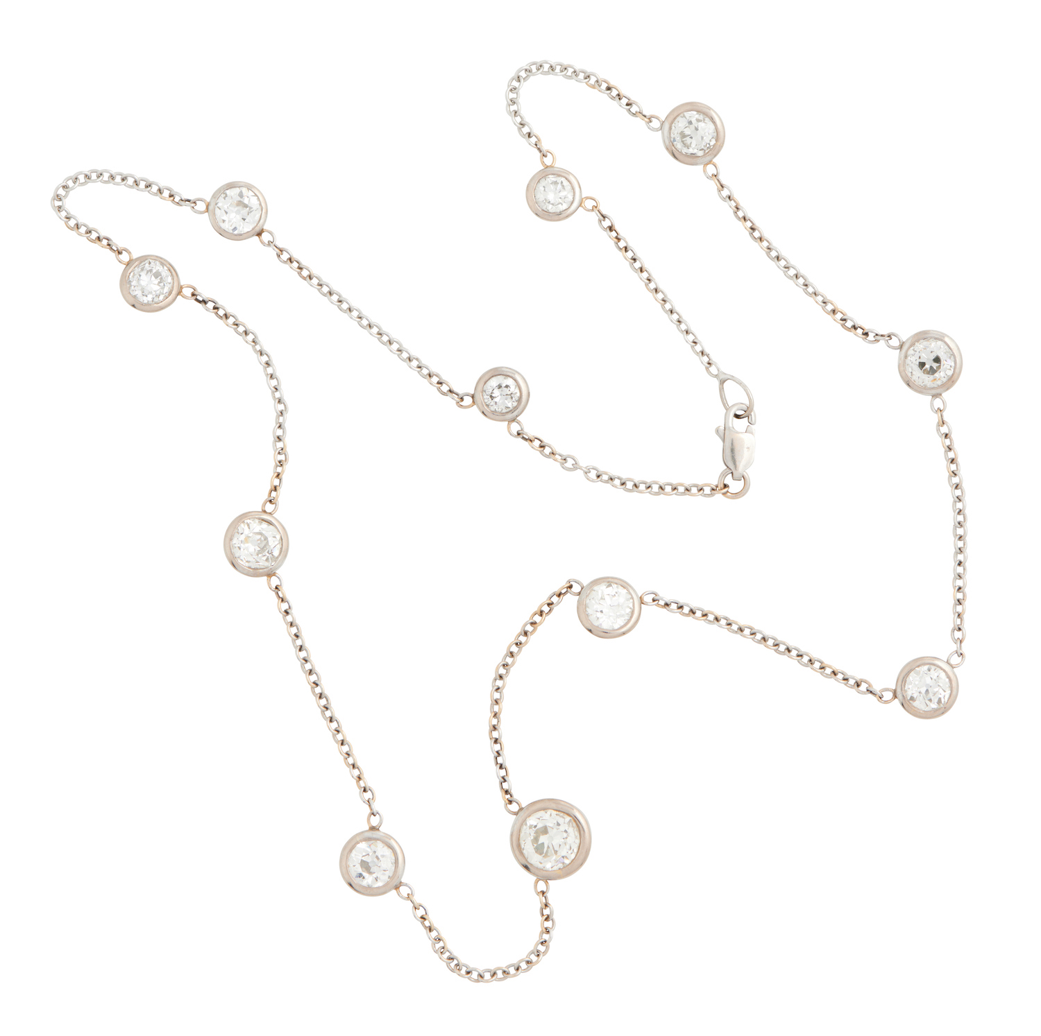The fine trace chain, set at intervals with eleven graduating bezel-set old European-cut diamonds together weighing approximately 5.50 carats, completed by a parrot clasp, length approximately 430mm.