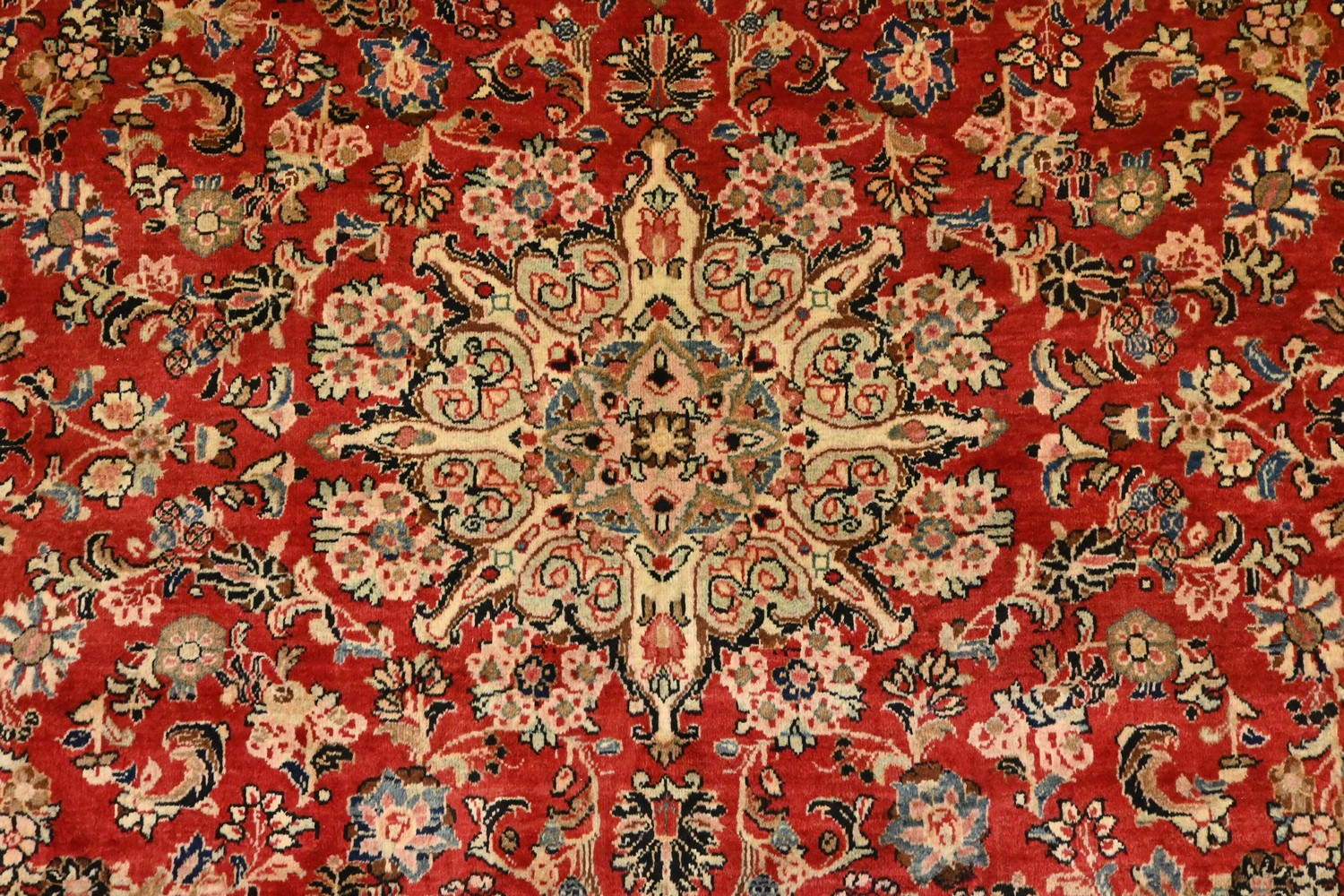 A STUNNING CIRCA 1980'S PALATIAL SIZE PERSIAN SAROUQ MAHAL CARPET. 100% HAND SPUN WOOL, DENSE SOLID PILE, ORGANIC DYES. FINELY HAND KNOTTED WITH TRADITIONAL DESIGN OF CENTRAL MEDALLION & QUARTERED CORNER MEDALLIONS IN FRENCH BLUE, IVORY & ROSE ON A SOFT MELLOW RED FIELD HIGHLIGHTED IN CORAL. WITH FLORAL SPRAYS, PALMETTES IN TONES OF FRENCH BLUE AND PISTACHIO GREEN. MAJOR BORDER IN CHAMPAGNE OF PALMETTES & FLORAL SPRAYS. EX-GALLERY EXHIBITED CARPET. ORIGIN: PERSIA - RRP: $12,000 - SIZE: 480 X 332 CM. DOCUMENTATION OF AUTHENTICITY INCLUDED