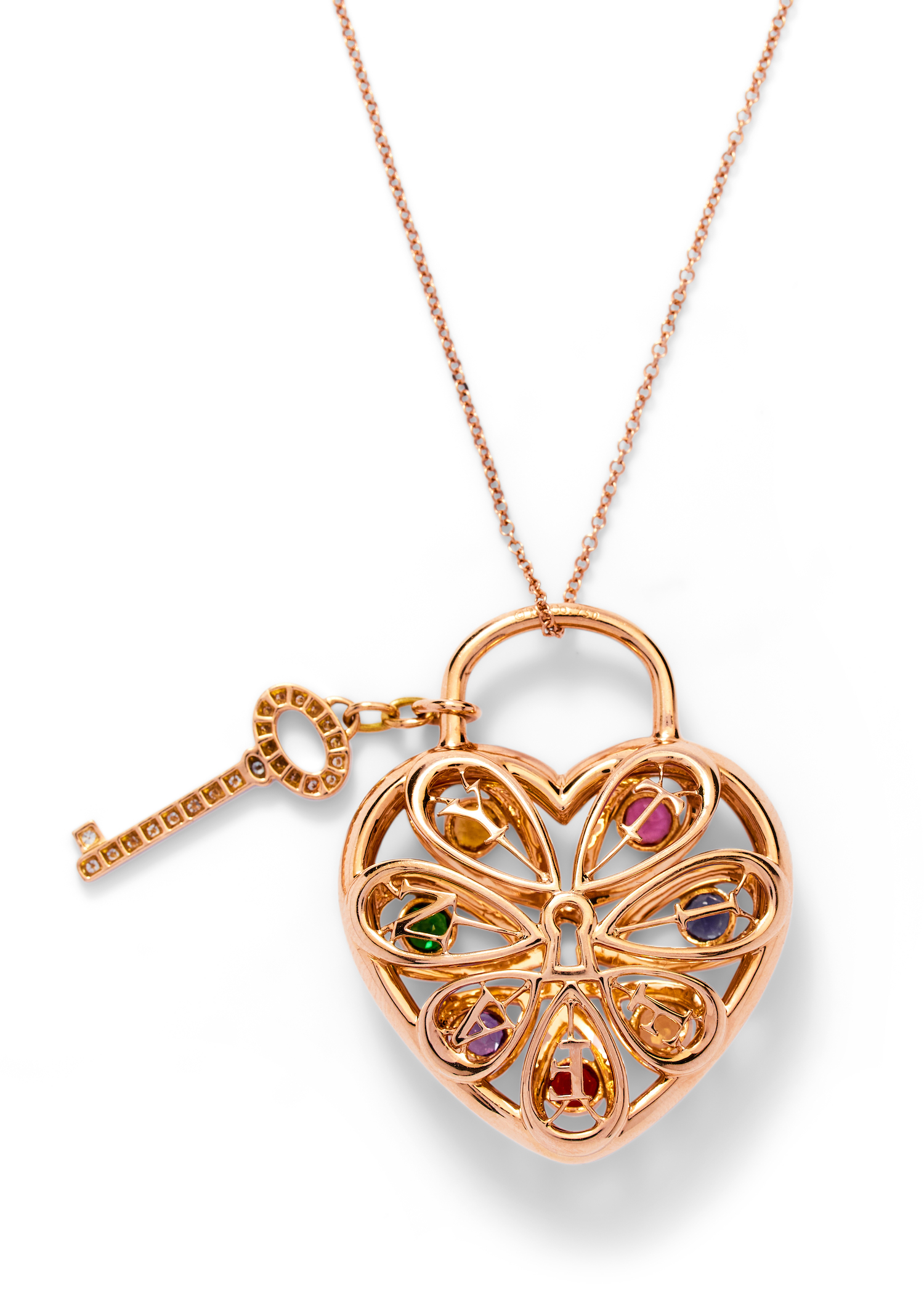 Of bombé form, the openwork heart shaped padlock is pavé-set to the front with brilliant-cut diamonds between collet-set circular-cut gemstones including citrine, tsavorite, amethyst, fire opal, yellow opal, iolite and pink tourmaline supported by a key charm pavé-set to the front with diamonds, the reverse featuring an openwork foliate pattern with 'TIFFANY' logotype, supported from a trace chain, the diamonds together weighing 2.76 carats, mounted in 18ct pink gold, pendant length 38mm, pendant width 30mm, inner circumference 460mm, signed T&Co. for Tiffany & Co.