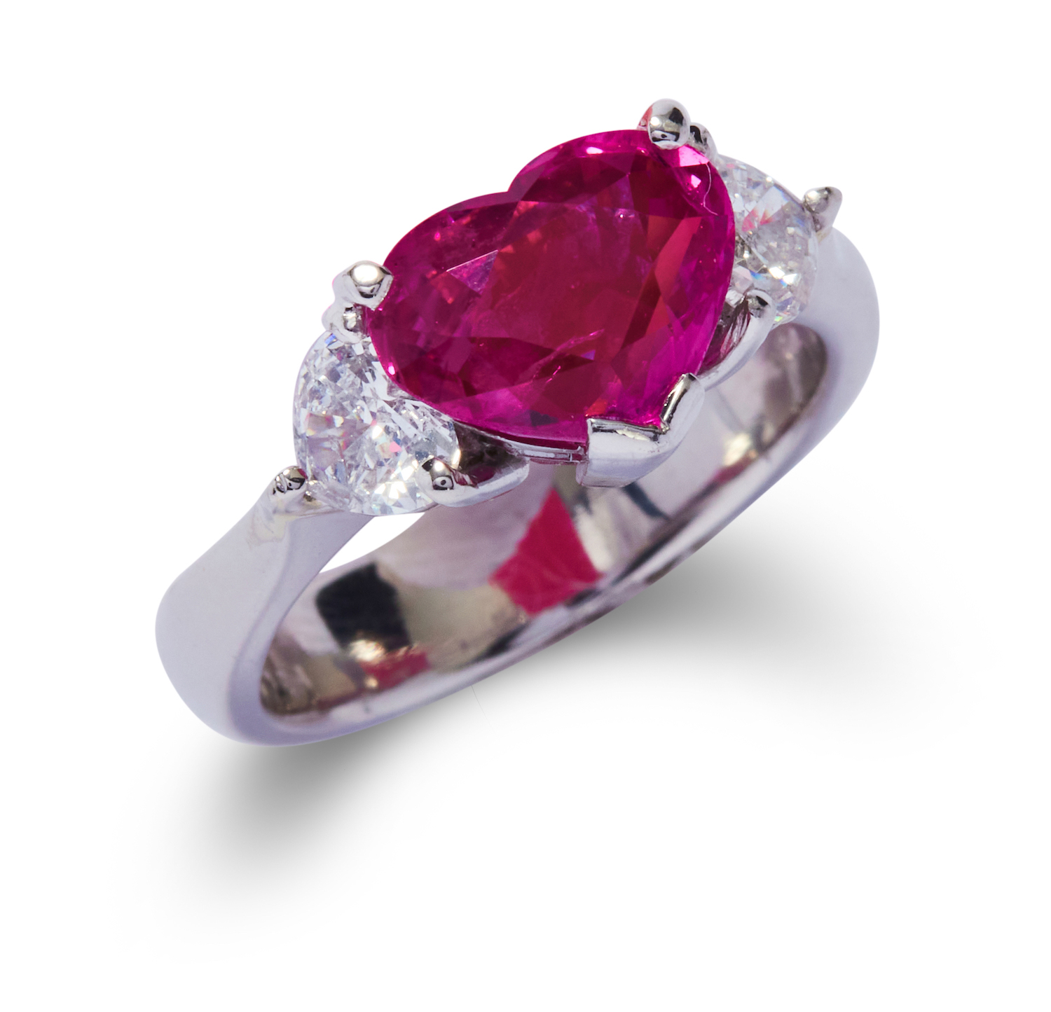 The heart-shaped ruby weighing approximately 3.05 carats, is claw-set between a pair of heart-shaped diamonds together stated to weigh 0.73 carats, mounted in platinum, size L.
