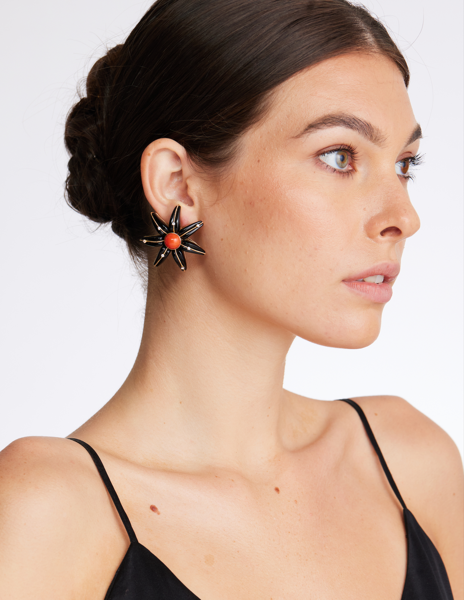 Each designed as a seven-point star centring a collet-set coral bead framed by sculpted black onyx rays applied with rope twist accents surmounted by a claw-set brilliant-cut diamond, mounted in 18ct gold, diameter 41mm, post and clip fittings.