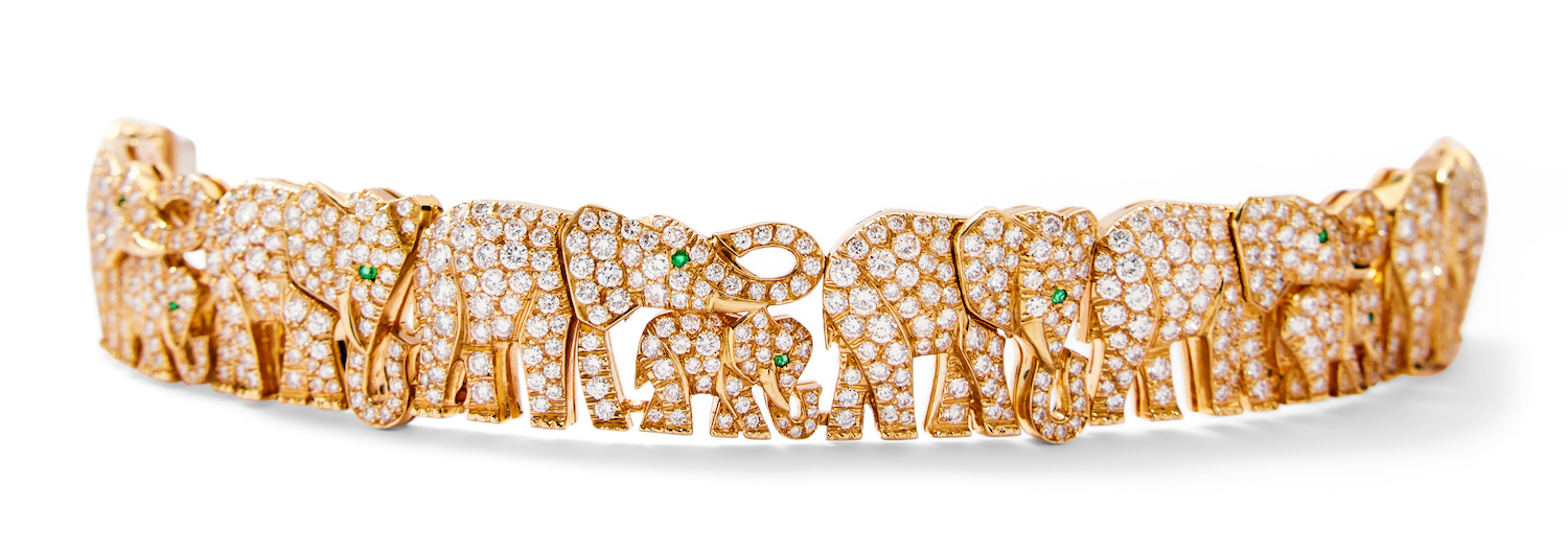 The 18mm wide strap is designed as a continuous series of mother and calf elephant motifs accented with circular-cut emerald eyes, the bodies pavé-set with brilliant-cut diamonds, the diamonds together weighing 8.00 to 10.00 carats, mounted in 18ct gold, length approximately 165mm, numbered 7XXXX9, French assay and maker's mark (Pierre Brun), signed Cartier.