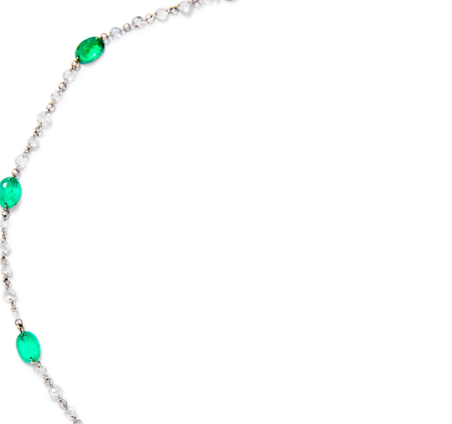Designed as a line of oval-shaped emeralds alternating between trace link connectors accented at intervals with rose-cut diamonds completed by a parrot clasp, the emeralds and diamonds together weighing approximately 13.50 carats and 5.24 carats respectively, inner circumference 760mm.