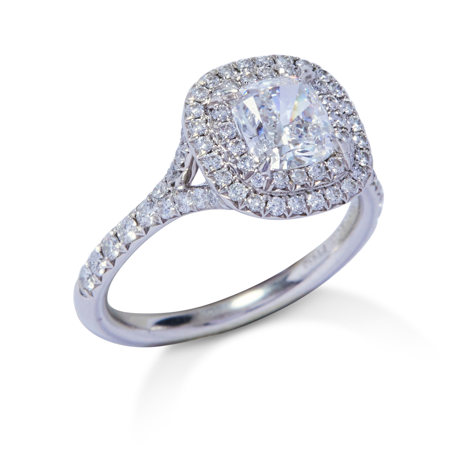 Of cluster design, centring a claw-set cushion-shaped diamond weighing 0.93 carats, framed by a double halo of brilliant-cut diamonds to similarly set split shoulders, the small diamonds together weighing approximately 0.22 carats, mounted in platinum, size J, numbered, signed Tiffany & Co.