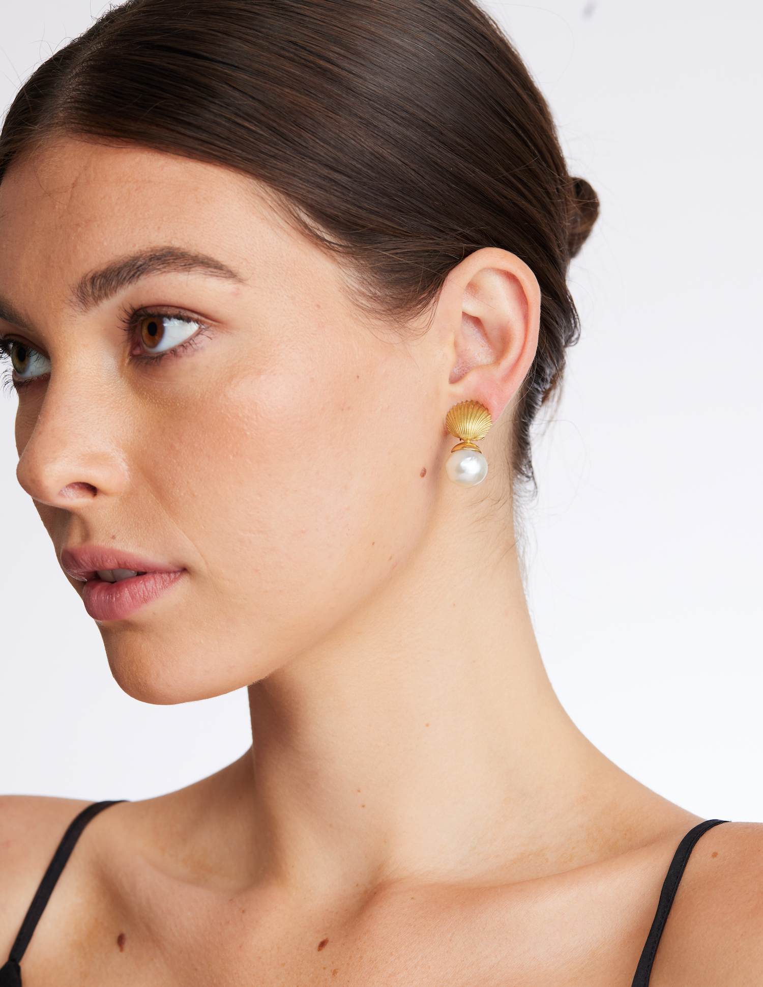 Each terminating on a 12mm to 13mm baroque cultured pearl, surmounted by a scallop shell motif, length 28mm, clip fittings, signed WHITE for Tony White.