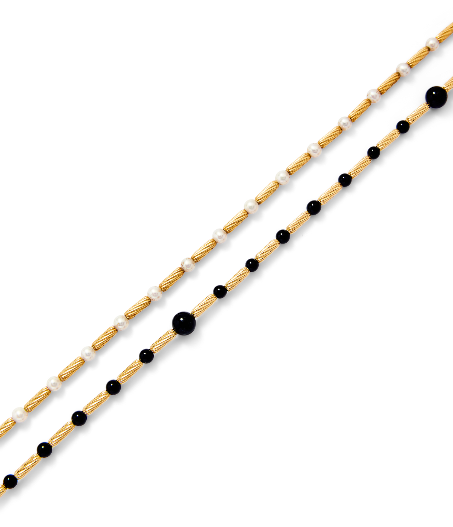 Comprising: a necklace composed of a line of textured gold cylindrical beads alternating between round onyx beads, completed by a toggle clasp; and a gold and cultured pearl necklace, en suite, necklace lengths 910mm and 930mm respectively, signed DY for David Yurman (2).