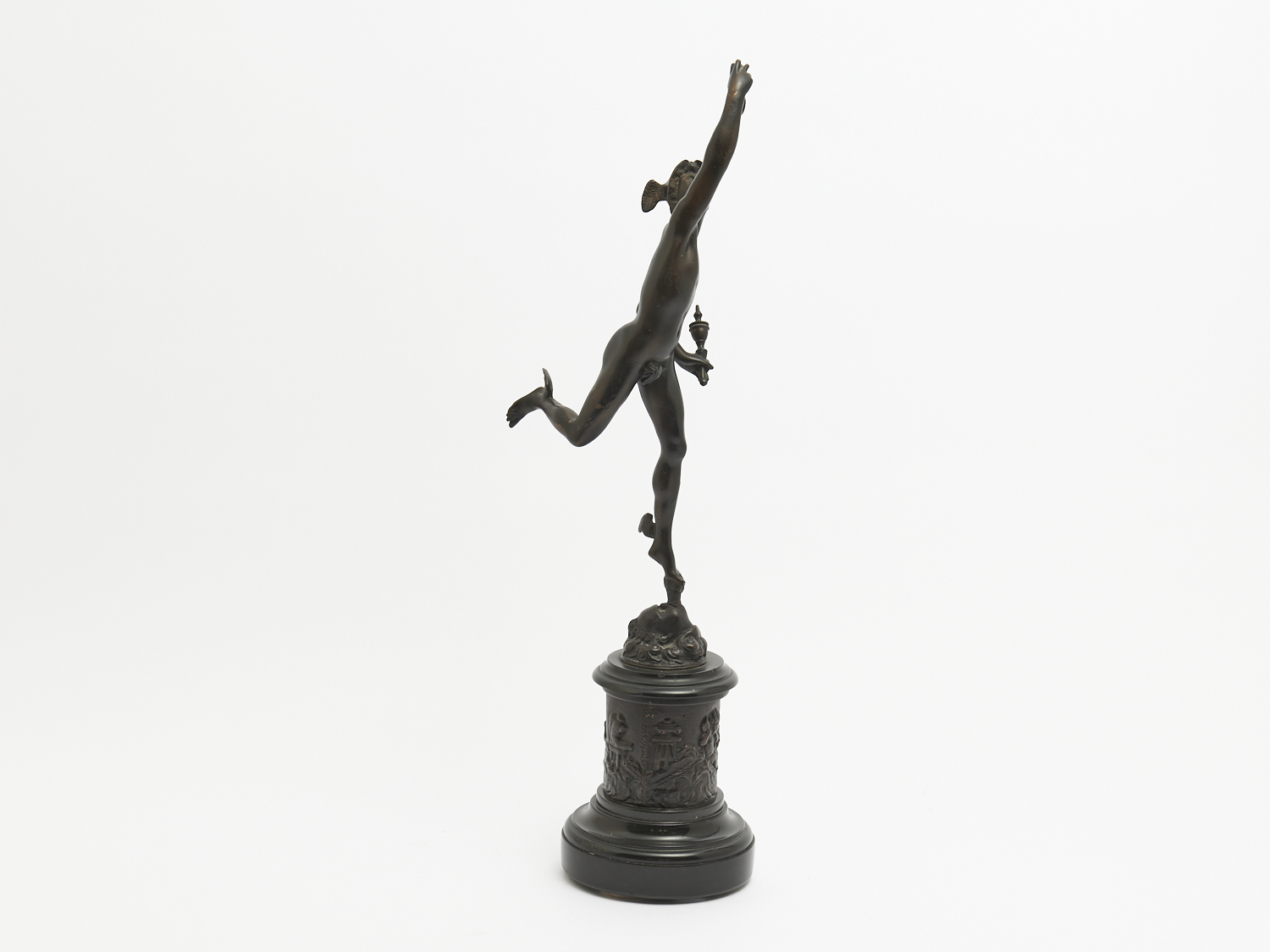 AN ANTIQUE-STYLE PATINATED METAL FIGURE OF MERCURY, AFTER GIAMBOLOGNA H.59CM, LEONARD JOEL LOCAL DELIVERY: SMALL