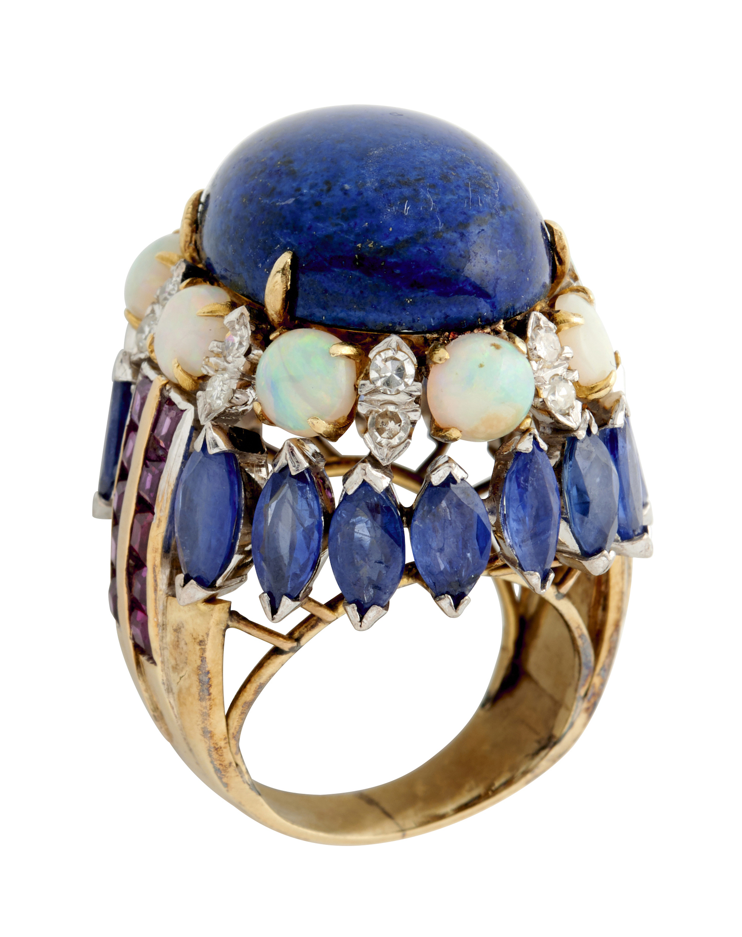 Of bombé design, centring a claw-set oval lapis cut en cabochon weighing approximately 12.40 carats, within a surround of circular cabochon opals and pairs of brilliant-cut diamonds, within a further surround of marquise-cut sapphires, to shoulders channel-set with carre-cut rubies, the diamonds together weighing approximately 0.36 carats, the sapphires together weighing approximately 3.00 carats, the rubies together weighing approximately 0.40 carats, size H 1/2.