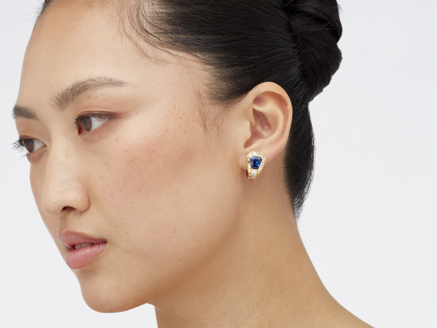Each earring centring a collet-set fancy-cut sapphire within a surround of trapezoid and baguette-cut diamonds, to post and clip fittings, length approximately 20mm.