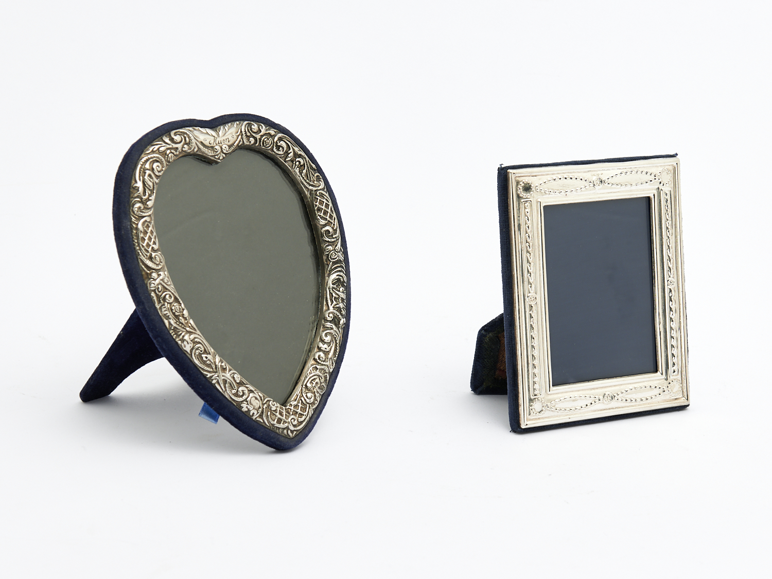 A RECTANGULAR STERLING SILVER FRAME AND A HEART-SHAPED SILVER PLATE FRAME H.17CM (TALLEST), LEONARD JOEL LOCAL DELIVERY: SMALL