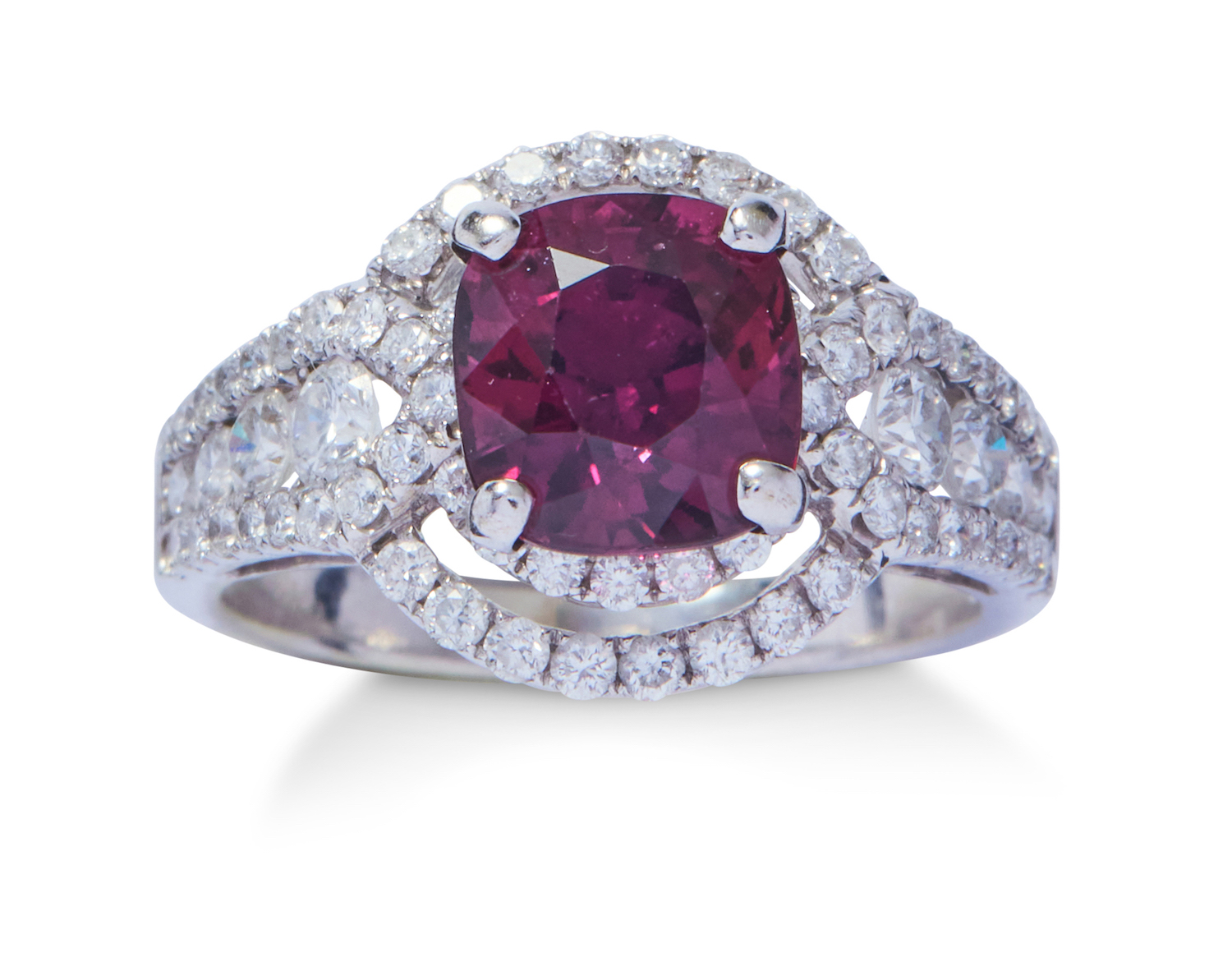 Centring a claw-set cushion-shaped ruby weighing 2.84 carats framed by an openwork surround pavé-set with brilliant-cut diamonds to similarly-set split shoulders, mounted in 18ct white gold, size L1/2.