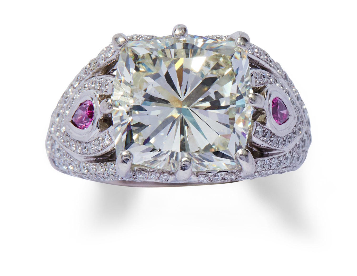 Of bombé form centring a claw-set modified square brilliant-cut diamond weighing 10.25 carats, framed by an openwork geometric surround pavé-set with near colourless brilliant-cut diamonds, the shoulders accented with an Argyle natural fancy intense pink pear-shaped diamond, the pink and small near colourless diamonds together weighing approximately 0.29 carats and 1.65 carats respectively, mounted in platinum, size I 1/2, adjustable, maker's mark HB for Hardy Brothers.