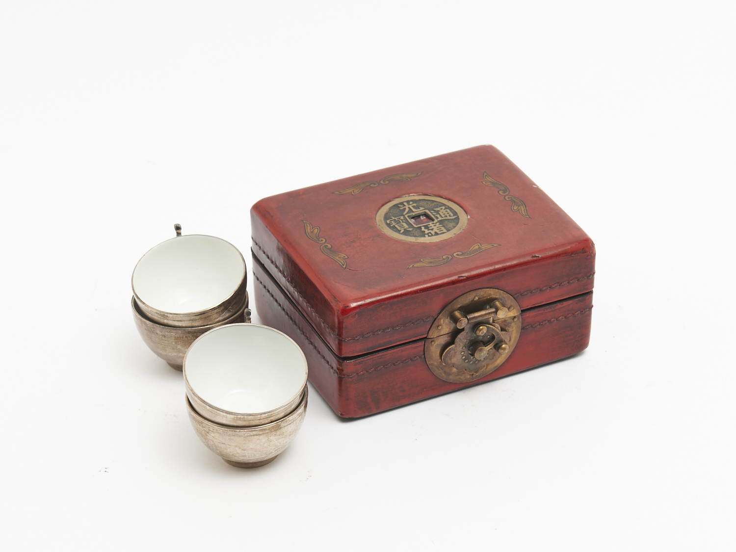 FOUR REPUBLIC SILVER AND PORCELAIN TEA CUPS WITH BOX H.3.5CM (CUPS) AND W.14CM (BOX), LEONARD JOEL LOCAL DELIVERY: SMALL