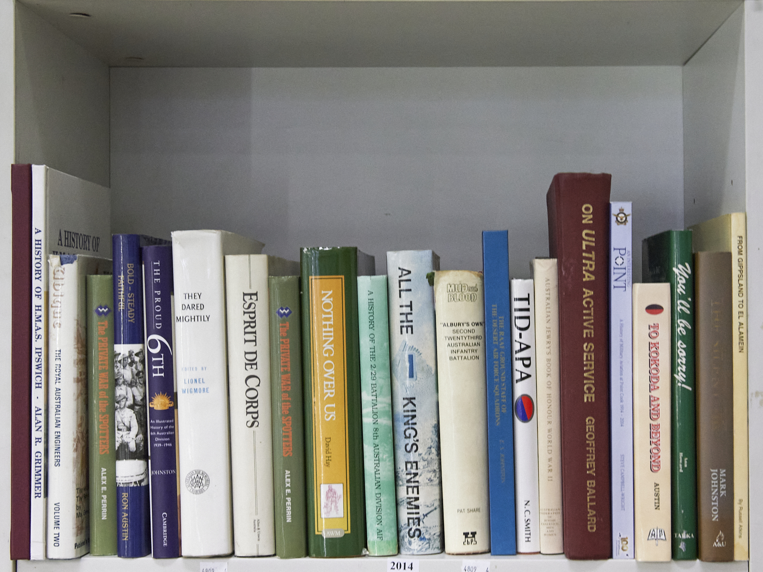 A SHELF OF AUSTRALIAN MILITARY HOSTORY INCLUDING DAVID HAY "NOTHING OVER US" A HISTORY OF THE 2/29 BATTAKION 8TH AUGUST DIVISION, ESPRIT DE CORPS LIONEL WIGMORE "THEY DARED MIGHTILY", LEONARD JOEL LOCAL DELIVERY: MEDIUM