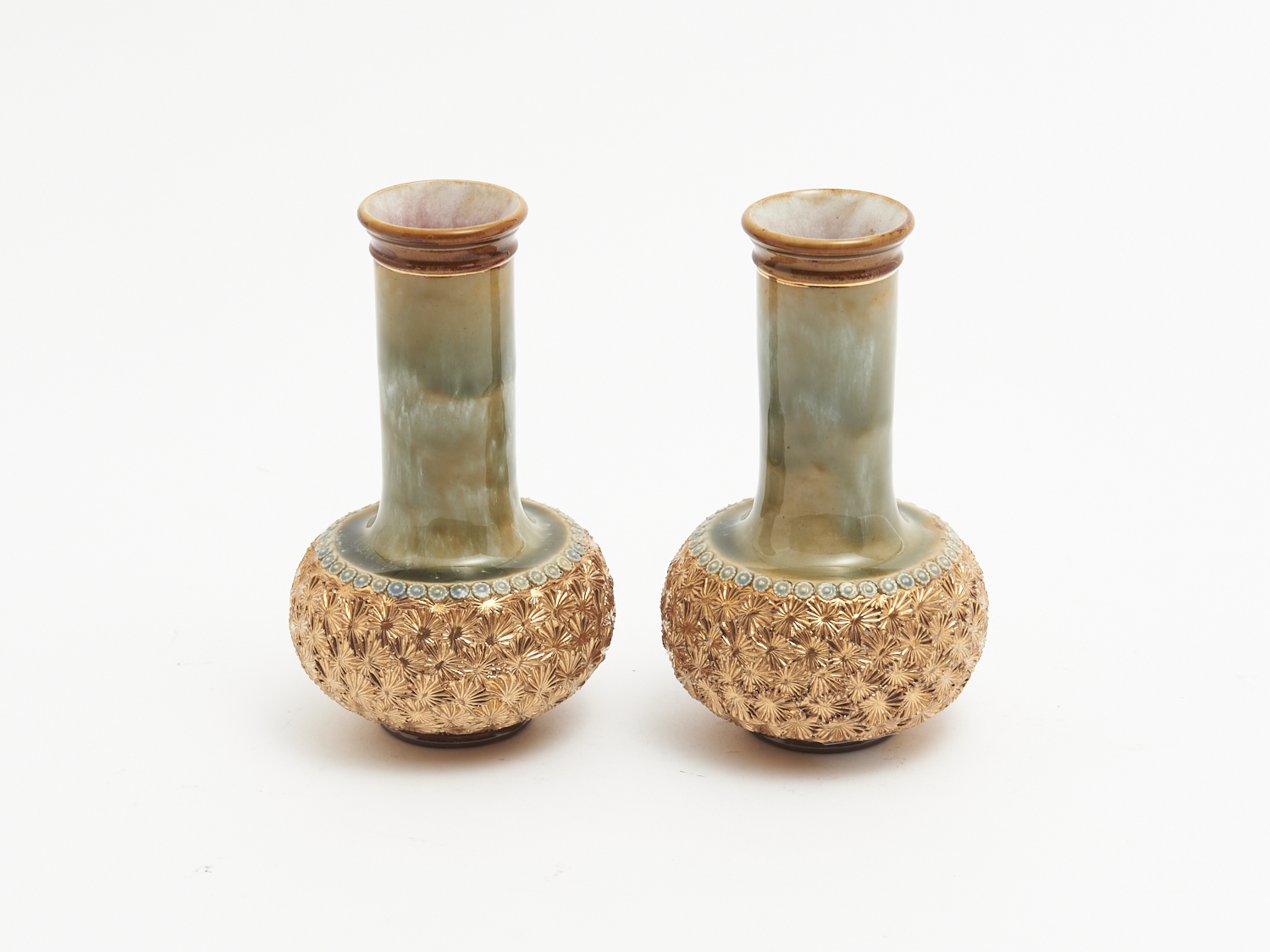 A PAIR OF ROYAL DOULTON STONEWARE VASES WITH GILT DETAILING H.16CM, LEONARD JOEL LOCAL DELIVERY: SMALL