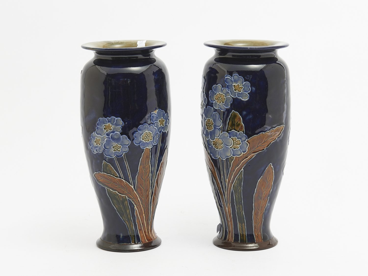A PAIR OF ROYAL DOULTON STONEWARE VASES, INTIALLED 'H' TO UNDERSIDE OF BASE (ONE WITH SMALL HOLE TO BASE), H.27CM, LEONARD JOEL LOCAL DELIVERY: SMALL