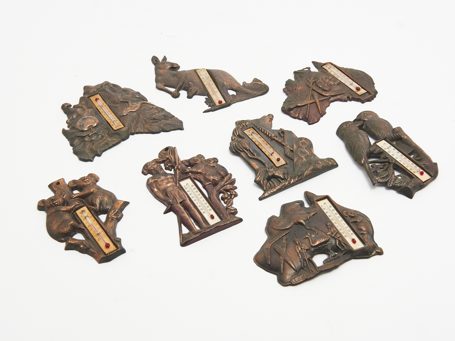 EIGHT AUSTRALIAN THEMED WALL HANGING THERMOMETERS H.13.5CM (LARGEST) LEONARD JOEL LOCAL DELIVERY: SMALL