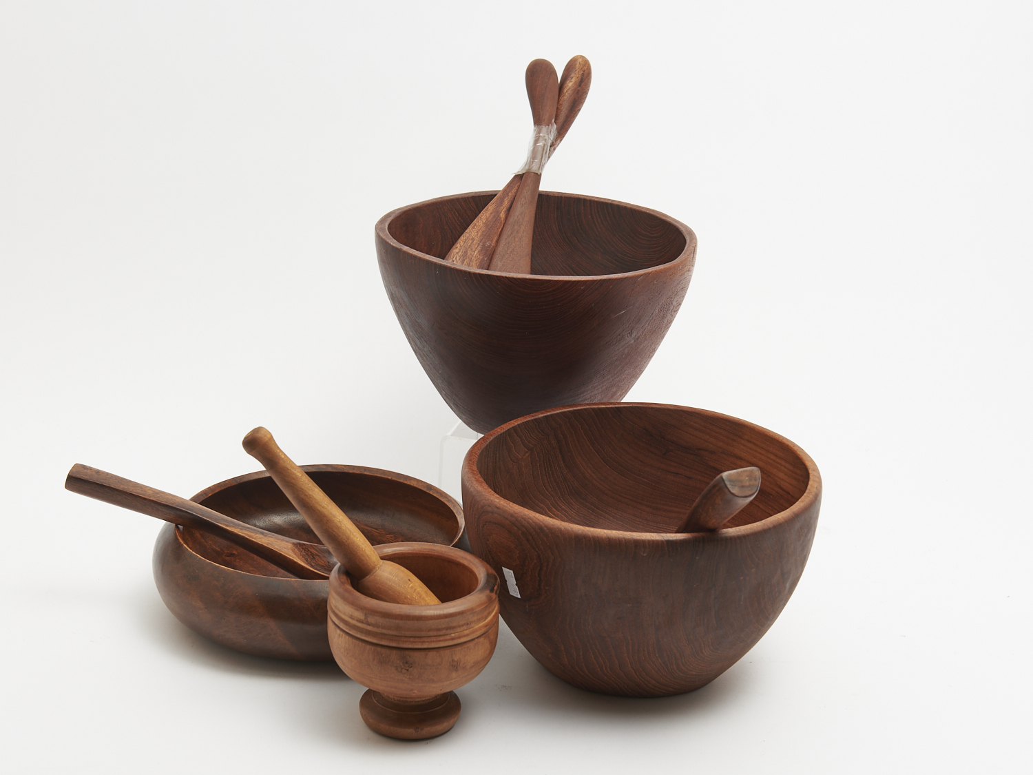 A GROUP OF DANISH TEAK SERVING BOWLS, SERVERS AND A MORTAR AND PESTLE H.15CM (TALLEST), LEONARD JOEL LOCAL DELIVERY: MEDIUM
