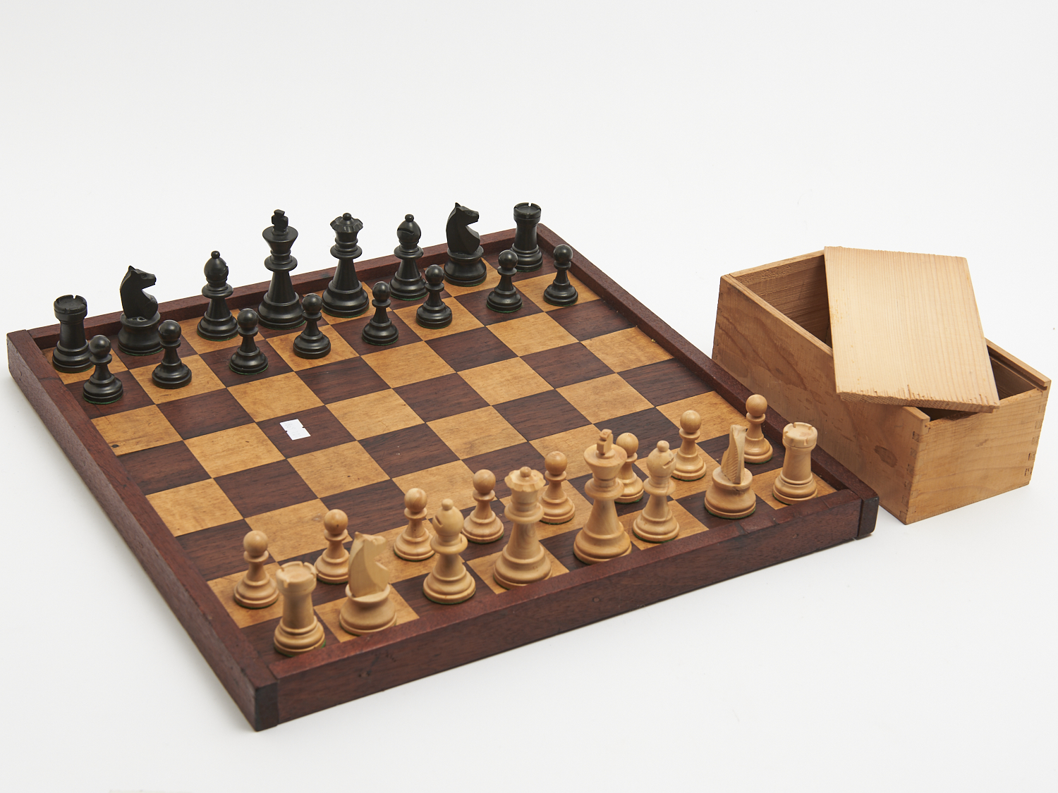 A CEDAR AND PINE CHESSBOARD WITH A SET OF BOXWOOD AND EBONY CHESS PIECES 41 X 41CM, LEONARD JOEL LOCAL DELIVERY: MEDIUM
