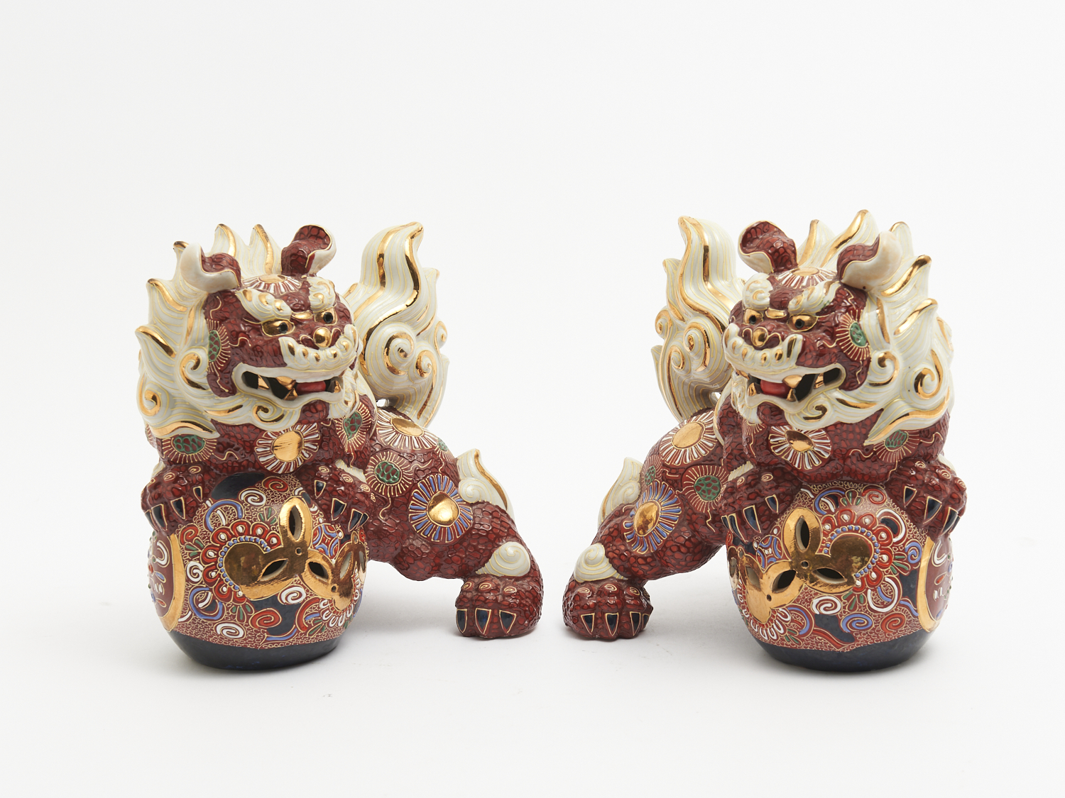 A PAIR OF ORIENTAL GLAZED POTTERY FOO LIONS WITH ENAMELLED DETAIL H.25.5, LEONARD JOEL LOCAL DELIVERY: MEDIUM