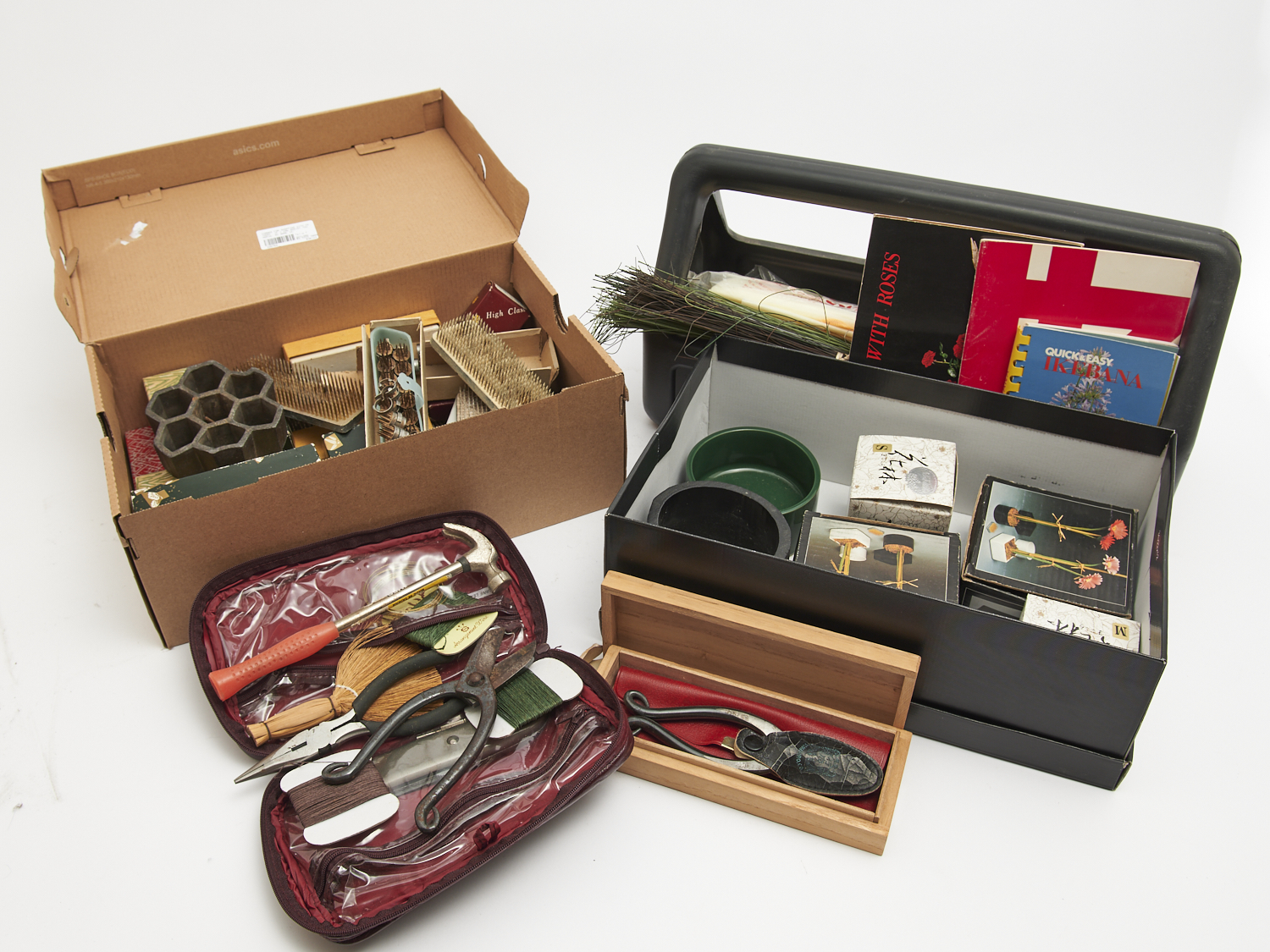 AN IKEBANA STARTER KIT WITH TOOLS AND A LARGE COLLECTION OF METAL KENZAN (FROGS)