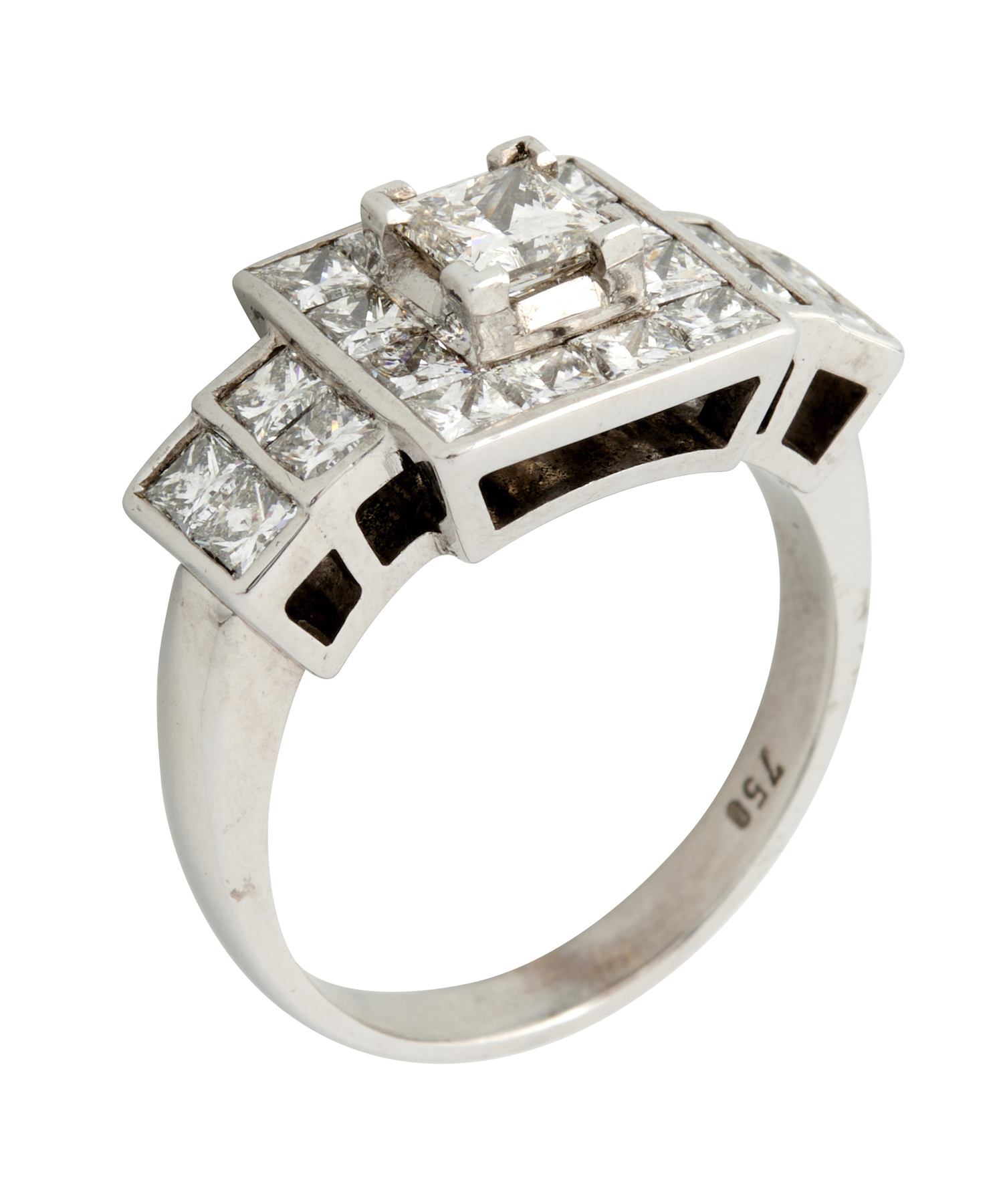 Of cluster design, centring a corner-set princess cut diamond, within a square surround and shoulders detailed further princess-cut diamonds, the diamonds together weighing approximately 2.50 carats, size O.