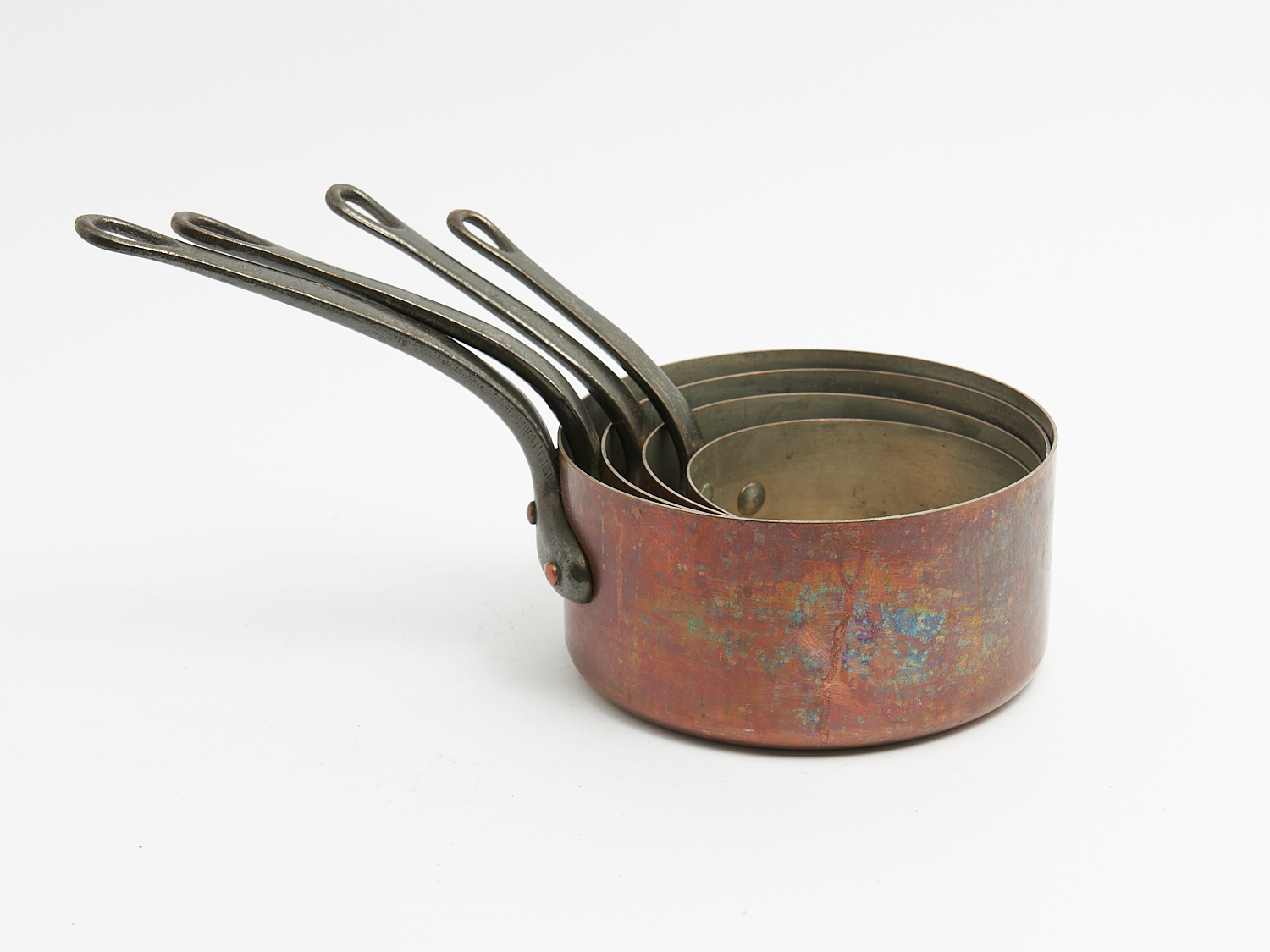 AN ANTIQUE SET OF FOUR HEAVY COPPER AND CAST-IRON HANDLED SAUCEPANS DIA.20CM (LARGEST), LEONARD JOEL LOCAL DELIVERY: MEDIUM