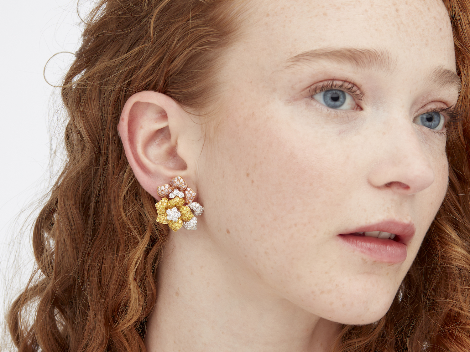 Each earring modelled as clusters of flowerheads, pavé-set throughout with brilliant-cut colourless, fancy pink and fancy yellow diamonds together weighing approximately 2.70 carats, to post and clip fittings, length approximately 30mm.