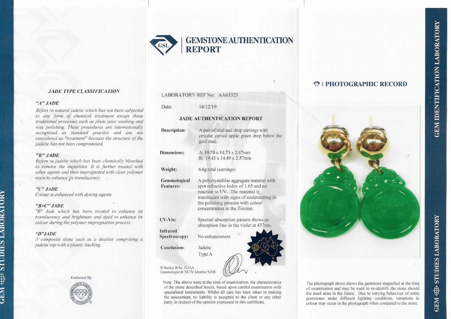 Accompanied by a GSL report numbered AA63323, dated 16 December 2019, stating that the jadeite is Type A, with no indication of enhancement.