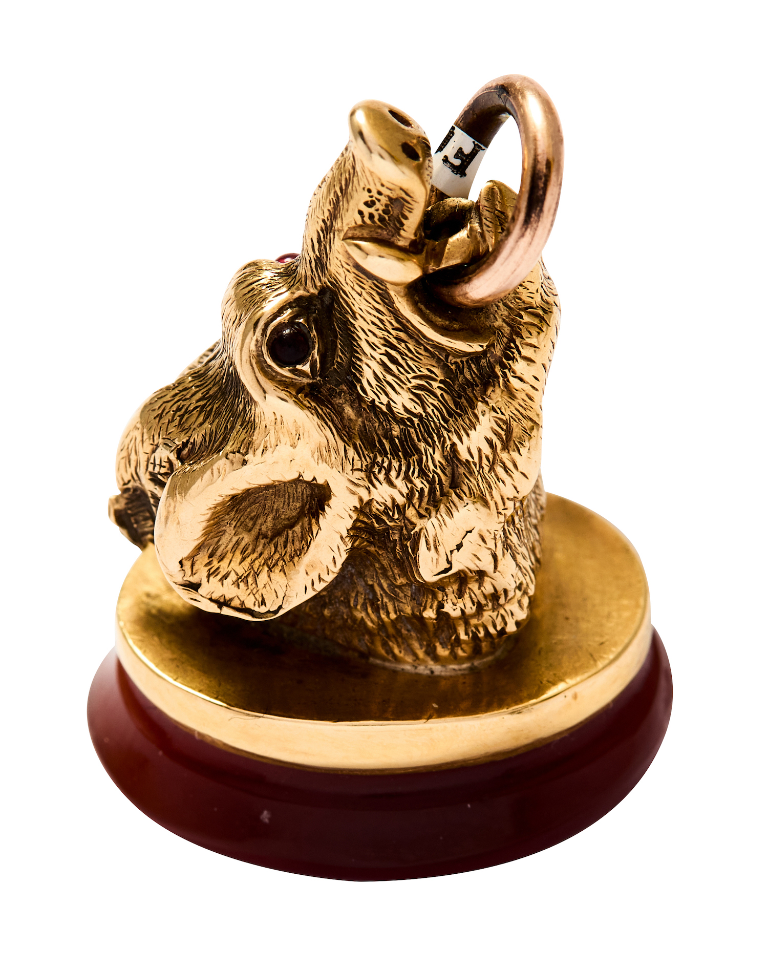 The base set with a carnelian plaque, surmounted by a boar's head, the eyes set with round red cabochon stones, length 19mm, width 16mm, height 27mm, total gross weight approximately 6 grams.