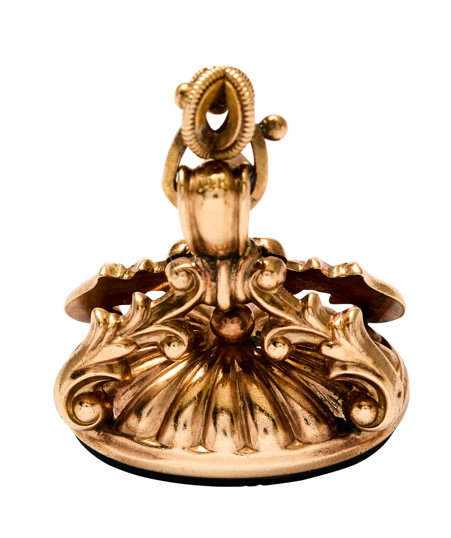 In our opinion, the bloodstone plaque is intact, with light abrasions and scratches throughout and some chips around the edge. There is some wear to the metal consistent with age.