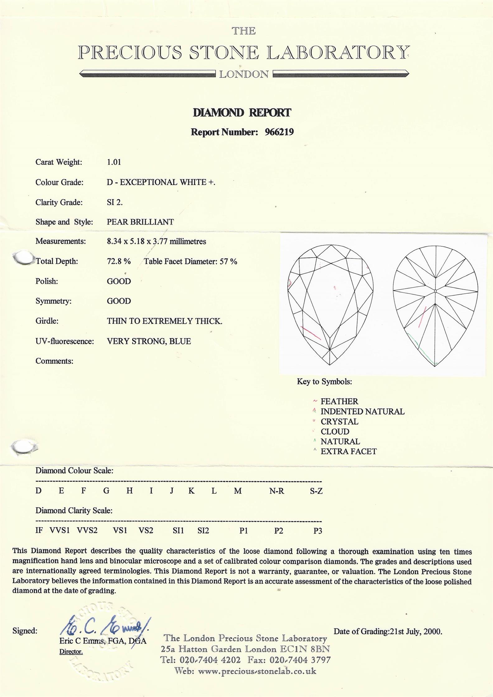 Accompanied by a The London Precious Stone Laboratory diamond report, numbered 966219, dated 21 July 2000, stating that the 1.01 carat diamond is D colour, SI2 clarity.