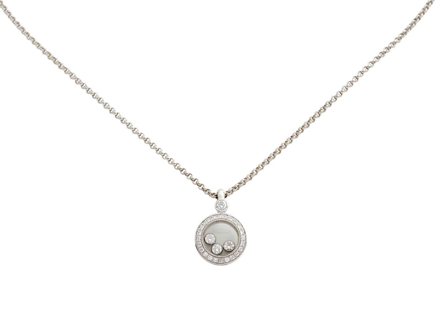 Comprising a circular glazed compartment framed by brilliant-cut diamonds and enclosing three floating collet-set diamonds, the diamonds together weighing approximately 0.24 carats, to a fine belcher link chain completed by a parrot clasp,