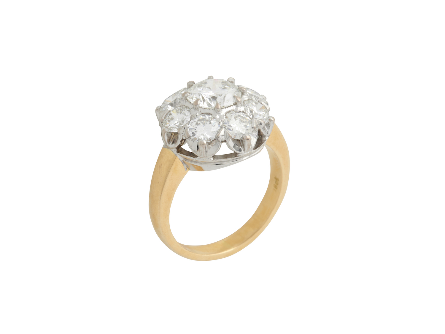 Of floral cluster design centring a claw-set brilliant-cut diamond weighing approximately 1.11 carats, within a surround of eight further diamonds together weighing approximately 1.38 carats, size M.