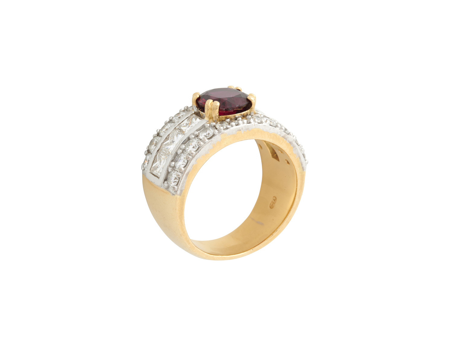 Claw-set with a circular-cut ruby weighing approximately 2.20 carats, flanked by channel-set princess-cut diamonds, within a brilliant-cut diamond border, the diamonds together weighing approximately 1.60 carats, Size N-O.