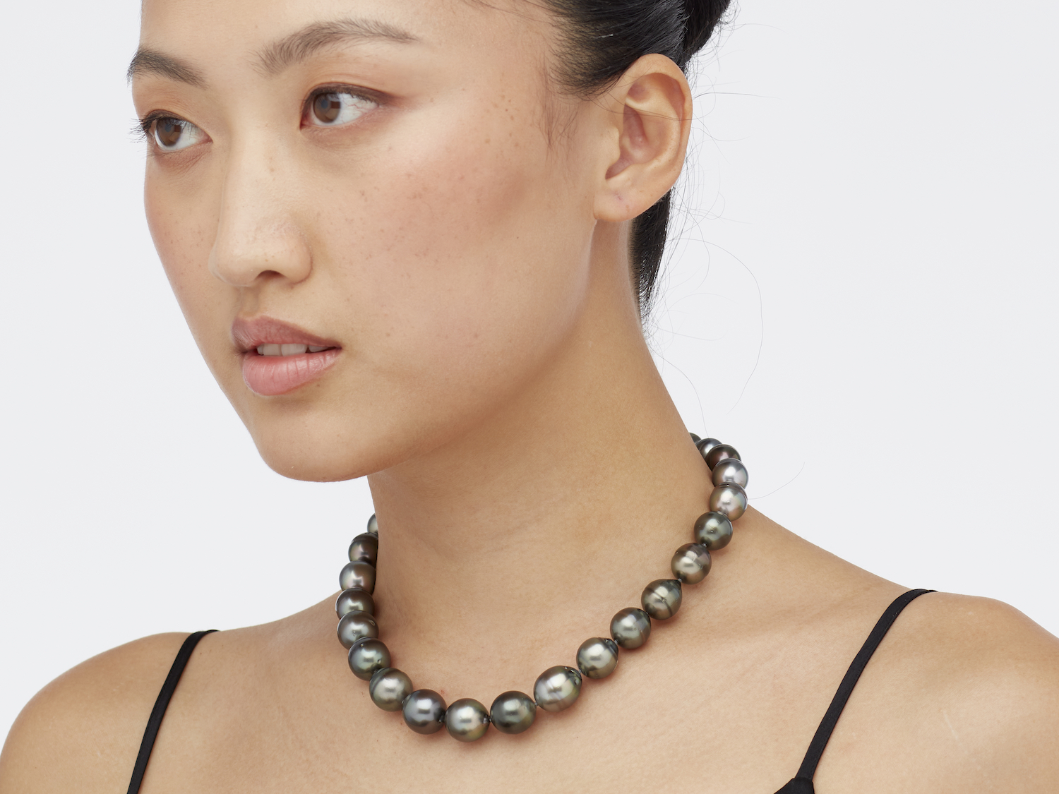 Comprising twenty-seven semi-baroque pearls of grey hues measuring approximately 12.50mm to 15.00mm, completed by a diamond set clasp in two-tone 18ct gold, length approximately 435mm.